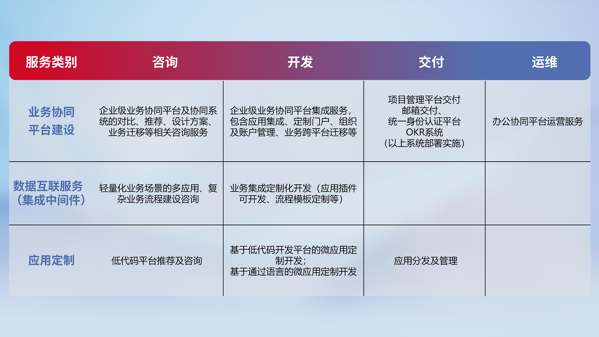 针对钉钉、、企微、、、IDaas等平台级产品提供产品的规划、、、方案、、、、交付、、、定制化开发等服务,,,,实现如统一协同办公、、智能客户服务、、混合会议管理、、智能数据查询、、、、等业务场景,,实现数字化转型。。
